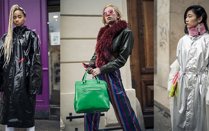 There was no lack in luster on the streets of Paris yesterday. From shiny PVC and metallic leather jackets to sparkly sequin pants, show-goers did what they could to stand out and shine. Fashion's elite also made a case for more unconventional trends, such as seatbelt belts, heavy duty chains repurposed as necklaces, and puffer jacket handbags (gotta keep that smartphone warm, somehow!).