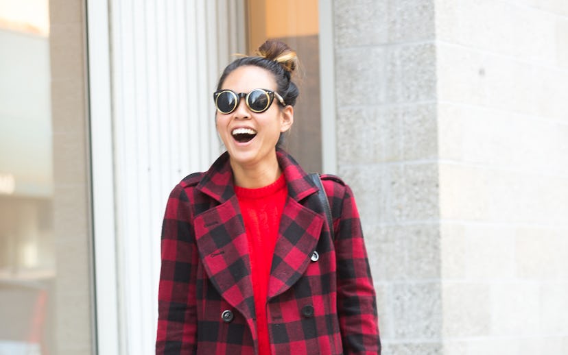 WHY: Because all black doesn’t have to be boring! An asymmetric skirt and coordinating sheet blouse is a fall go-to in our books, as is the perfect shade of red lipstick.
