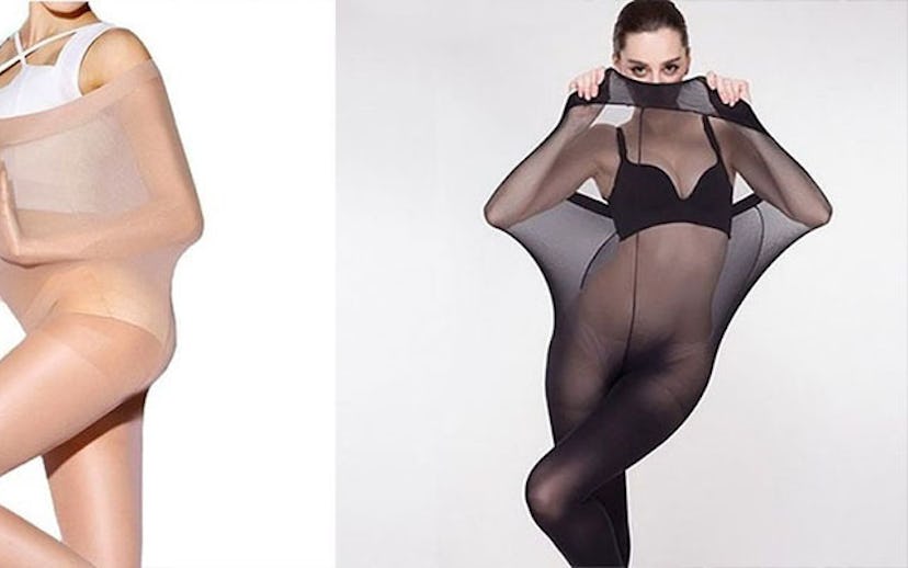 Generally, when women are shopping for tights, they'd like to know what they'll look like on them before purchasing, not what they would look like if a very slender model used them as a sleeping bag. Emphasizing that the tights someone is about to buy for their legs could fit an entire person is the exact opposite way to get someone to buy your product.