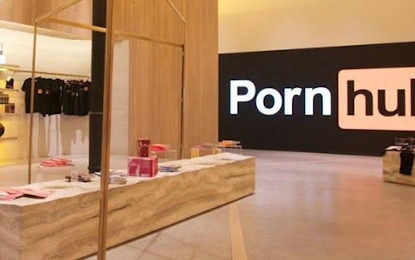 Inside the store, an entire wall doubles as a screen which shows the kind of footage you'd see on PornHub, soundtracked by a playlist of sounds from PornHub videos mixed by the Brooklyn-based artist collective Enstantine.