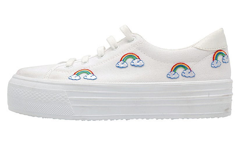The goal? To make it to Rainbow Road, of course. But while it's sort of impossible to find a 2014 version of the game, that's okay, because these sneakers will do the trick. Stamped with tiny rainbows, these white platforms are an ode to the '90s in the best way possible.
