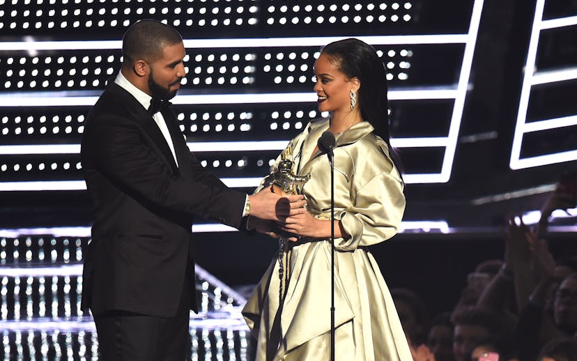 Rumor has it that Rihanna slept over at Drake's hotel afterward. Not a big deal, right? Well, she was seen walking around wearing a shirt dress on Monday—some people say it might even be the same shirt that Drake wore underneath his tuxedo at the VMAs.