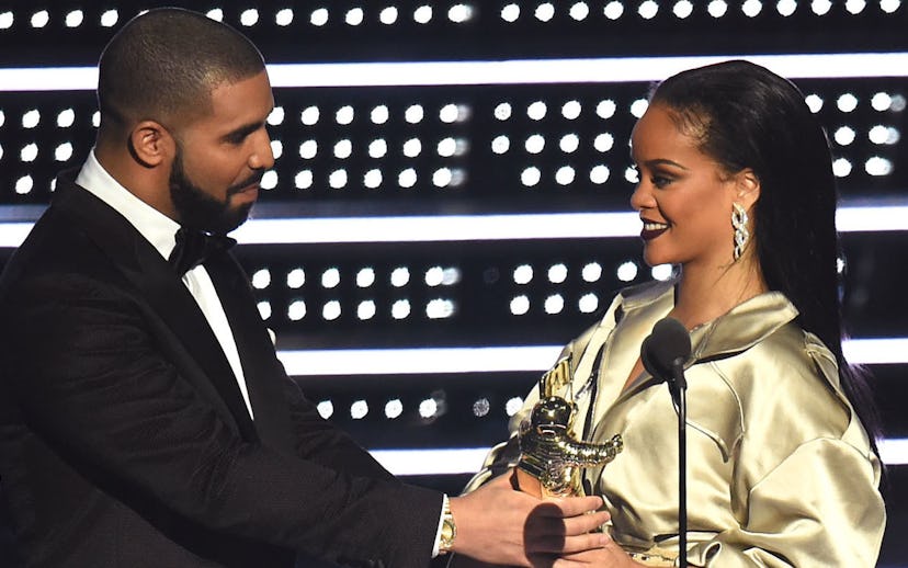 Speaking to Vogue for the magazine's June cover, Rihanna talked about everything from her forthcoming, size-inclusive SavagexFenty lingerie line to plans for a new reggae album (!!!). However, when asked about that moment, you know, the 2016 VMAs when Drake interrupted the presentation of her Vanguard Award to profess his undying love for her, writer Chioma Nnadi noted that she visibly winced at the mention of his name.