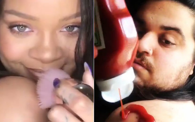 Rihanna shared the video, debuting the all-over highlighter and a new kabuki brush, a little over two weeks ago. It's an effortless piece of beauty content, frill- and phuck-free. Ever since, people have been getting creative on the internet, recreating the vibe using products that are decidedly not the $59 Body Lava and $34 brush. From pink shaving cream to ketchup to Lush products to, uh, laundry detergent and giant brooms, men (and a few women!) have been flexing their own takes on Rih's unfiltered beauty demos to wholesome, feel-good effect. A pop of the shoulder, a flirty vibe, and some viscous liquid and you, too, can live that fantasy.