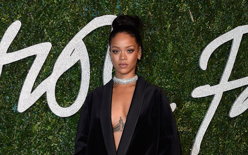 Okay, we may have been misleading in the title of this piece. It's not like Rihanna "forgot" her pants. Rihanna doesn't "forget" things. She opts to simply not participate in the concept of pants in this particular moment. And you know what? That is totally okay. Rihanna doesn't need to be confined by your socially constructed concepts of "pants" or "bottom halfs" or "trousers." She doesn't need trousers. Look, you know how when you have nothing to wear, you are like, "I'm just going to throw on this giant t-shirt and be done with it"? This is the RiRi version. Rihanna literally rolled up wearing a men's jacket three sizes too big, some sheer nylons, and still looks beyond stellar.