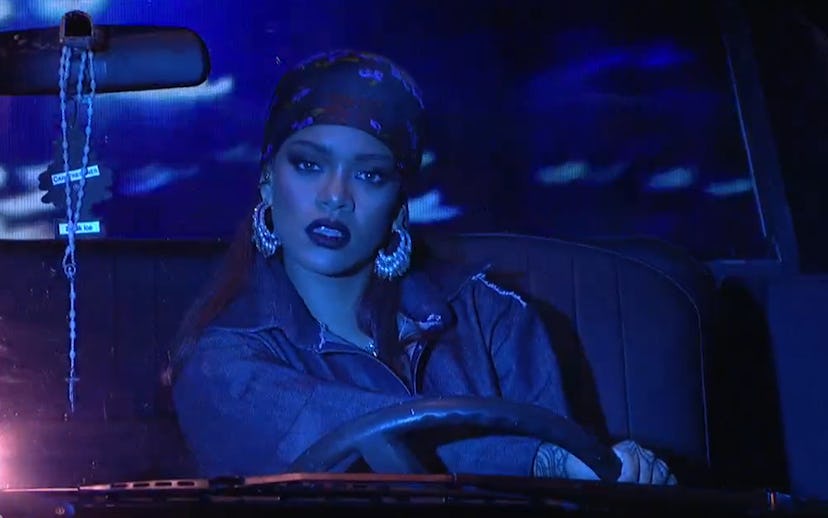 For the pop star’s live performance of “Bitch Better Have My Money,” she stayed true to the song’s tough, gangster vibe. Part of the SNL stage was transformed into a scene straight out of a blue-tinted crime film, placing Rihanna behind the wheel of an air freshener-decked car with a hostage in her backseat as she drives away from a flashing police cruiser. While this staging gives a more cinematic feel to the aggressive track, Rihanna eventually steps out on the stage with her crew of backup dancers to continue the performance with a more traditional dance number.