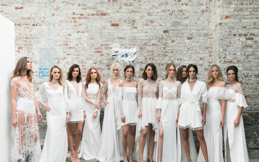 The collection was a refreshing alternative to the typically saccharine bridal looks shown during this time, with plenty of pants and separates, revealed midriffs, high slits, and lace chokers. The showstoppers came in the form of a fashion-forward wrap dress-robe hybrid and a stunning witchy sheer overcoat worn over a pair of high-waisted briefs and combat boots. "Our bride is sassy, rebellious, doesn’t care what people think. And free," says Arodaky. "She shows some leg, some back, wears slits, see-through [fabrics], and chokers." What's more rock 'n' roll than that?