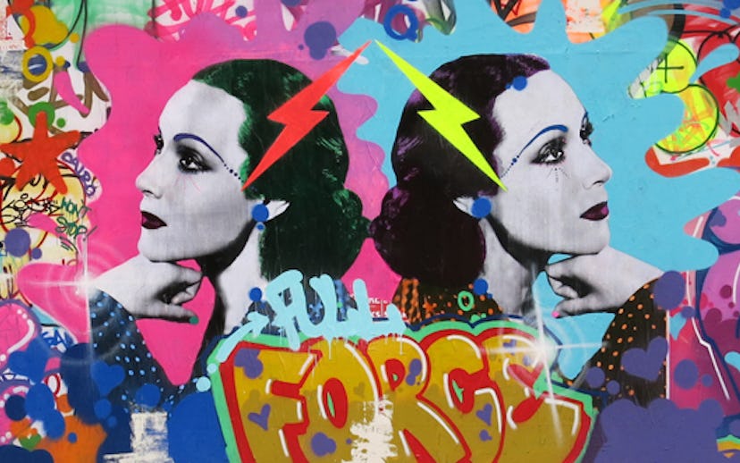If you’re not familiar with Indie184’s work, the native New Yorker has been a part of the underground art scene for over 15 years. Her work, influenced by abstract expressionism and pop art, blends colors and textures through mixed mediums—everything from painted graffiti to scraps of paper, photographs, and stylized imagery of powerful women. Her composed works channel messages of “self-empowerment and motivation,” she says.