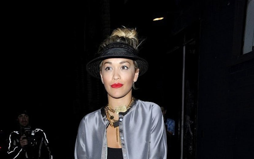 Ora made the old lady hat cool by tying her hair in a messy bun at the top of her head and keeping the rest of her outfit super sleek. Why she needed a visor at night though, we're not sure.