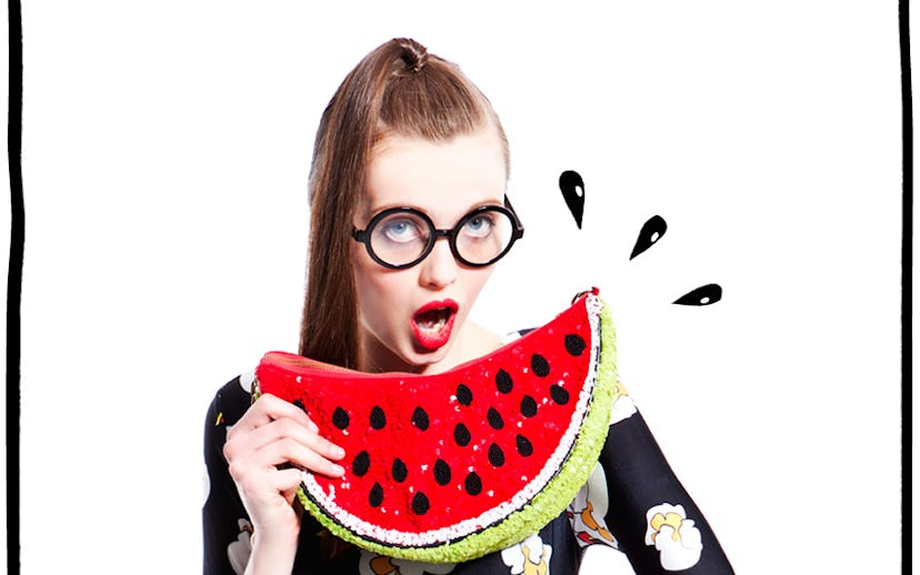 We get all of them this week with Rodnik. The British brand we--along with the likes of Rita Ora--love to love has a brand new lookbook, brand new pop art-inflected pieces, and a brand new e-shop. That's right, you can now order a popcorn print body-con dress, egg-covered blouse, or beaded match box purse with the click of a button.