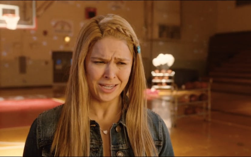 Dressed up for her date with the high school cool kid, Chad, the MMA fighter looks prim and pretty. But don’t let her fool you. When it’s revealed that Rousey has been set up by a Regina George-like mean girl (expertly played by Vanessa Bayer), she brings a—erm—no holds barred approach to the situation.