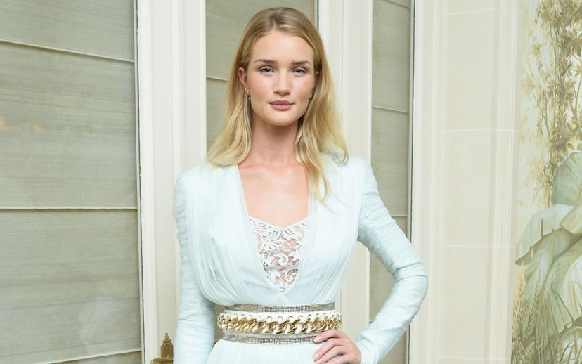 Holy smokes, Balmain! Last night we went to bed and dreamed of the lucky gals who would get to wear the creations from the Balmain spring '14 show, feathers and flouncy minidresses, rough denim jackets, stiletto booties, and when we woek up--boom!--there was Rosie Huntington-Whiteley in a perfect mint creation.
