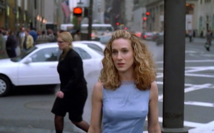 Entertainment Weekly found alternate footage that features Sarah Jessica Parker's Carrie Bradshaw listlessly walking around NYC in a blue dress, tripping when she sees her ad on the bus before smirking at herself and relatable clumsiness. It's... cute, but nowhere near as fun at the one that made the cut. For one, the tutu is synonymous with Carrie; it's our introduction to her off-kilter sense of style. Second, the splash is comic relief. In the original, the world and Carrie simply being in the wrong place at the wrong time is the source of her embarrassment. In this version, Carrie brings the embarrassment on herself. How very not fabulous.