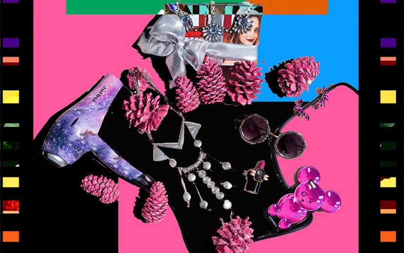 eva nyc: galaxy blow dryer—$60. iphoria: pink bear iPhone 5/5s case—$55. 8 other reasons: liquid candy ear cuff (purple/green)—$55. 8 other reasons: comeback head-piece—$68. love + leather: silver palace necklace—$100. gasoline glamour: gold rush glasses—$44. (available here.)