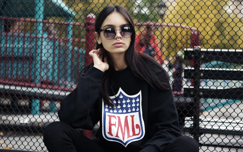 reason clothing: fml crewneck—$68. quay eyeware: steelcat—$45. galisfly: sun tribal faux septum ring—$34. (available here.)