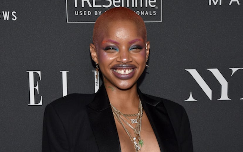 On Wednesday night, Woods showed up to Elle magazine’s NYFW kickoff celebration wearing a black suit from Seen. And seen she was—she went shirtless under the suit jacket, which was unbuttoned to put her belly on full display. To amp up the look even more, she paired the suit with multicolored eye, brow, lip, and cheek makeup, as well as mismatched slides.