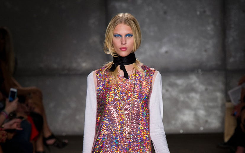 From the disco queen jumpsuits and minidresses at Marc by Marc Jacobs (let's not forget those star spangled evening dresses either!), to the classic Uptown separates at Oscar de la Renta, to Rodarte's look-at-me glittering L.A. babes, designers really mined the golden look for all its worth. Unexpected takes on shine appeared at Karen Walker, whose hippie dresses were coated with a subtle sheen, and at Richard Chai Love, where a dark blue sequin tank dress and midi-skirt melded minimalism and metallics, perfect for those of us who want to get glimmer-y without going full-on prom queen. (Although if you are looking for something sweet sixteen appropriate, just check out Betsey Johnson's radiant silver party dress. If anyone knows how to do shiny, it's Johnson.)