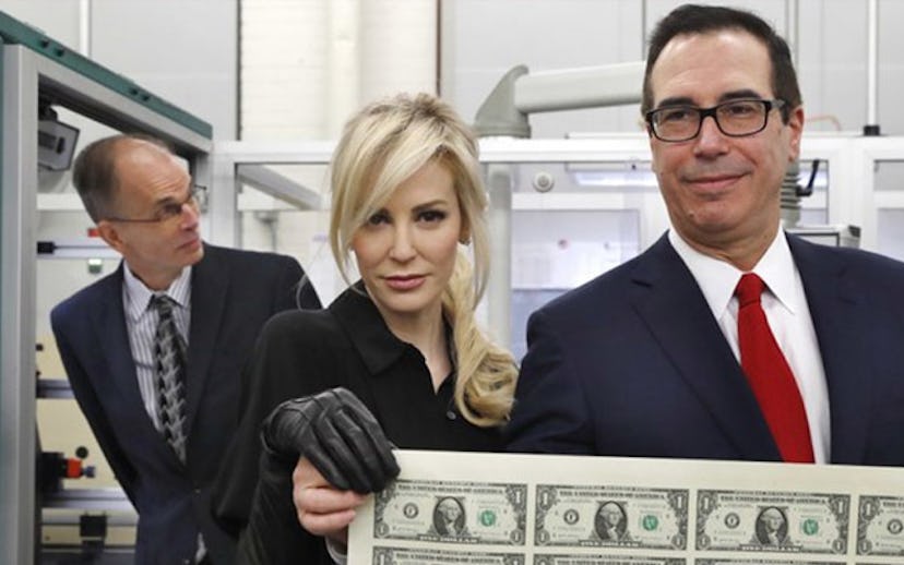 Mnuchin and Linton were touring the Bureau of Engraving and Printing, to see the production of the new $1 bills, which will have Mnuchin's signature on them. It's essentially two incredibly vain, self-absorbed people reaching their peak. It also could've been the first time either one of them has ever touched a dollar bill. Only, Linton had leather gloves on (because Cruella de Vil), so that technically doesn't even count.