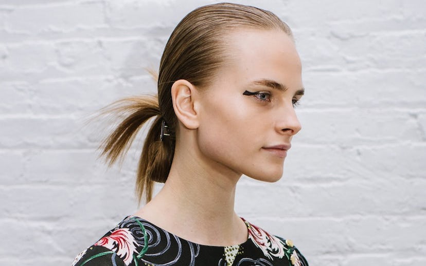 Backstage at Suno's NYFW Fall/Winter 2015 show, makeup artist Alice Lane was making us forget everything we thought we knew about eyeliner. Using Maybelline's new Eye Studio Master Graphic, a marker-like liquid eyeliner, she created solid rectangles at the corner of each model's eye. The effect was striking, like a more geometric, futuristic cat-eye. "Think of this makeup like an accesory," Lane said. "Like you're putting on a pair of really cool sunglasses."