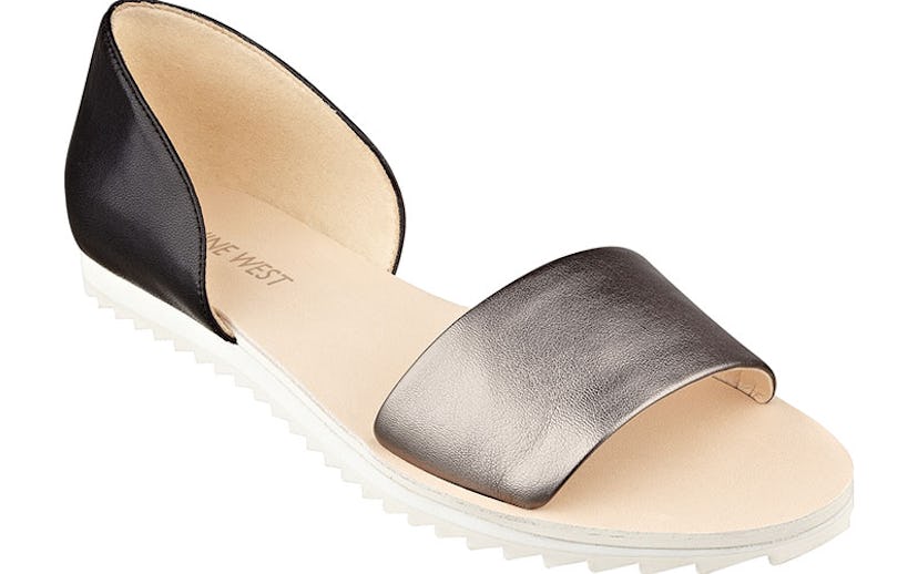 Nine West, Qualify open toe flats in black/pewter leather, $69, available at ninewest.com.