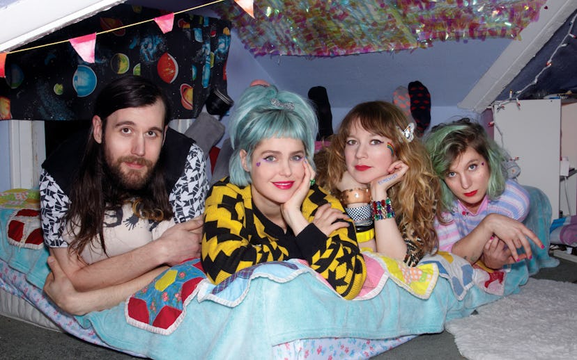 “Talk,” off Tacocat's newest record, Lost Time, is one of those songs, the video for which we are premiering right here. Among a sea of sparkling pony tunes (“Horse Grrls”) and sarcastic-sweet breakup anthems (“You Can’t Fire Me, I Quit”), “Talk” is a darker song—at least sonically. “I would definitely say if everything’s at a hot pink to a medium teal, that the song is probably like a dark purple—with glitter in it,” says lead singer Emily Nokes. That color palate definitely makes an appearance in the Marcy Stone-Francois-directed video, which is replete with black lights, glow-in-the-dark stars, and Lite-Brite (Lite-Brite!) stop-motion animation.