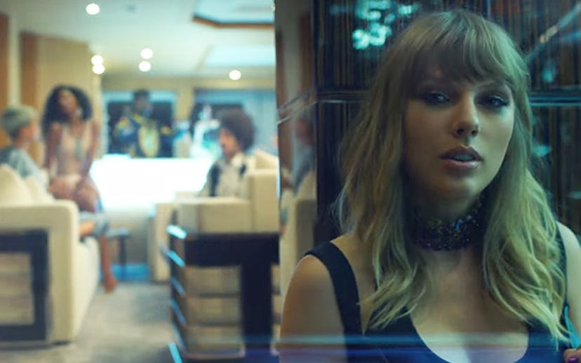 The video opens with Swift and Future on a yacht in Miami, singing about how she's got some "big enemies." The yacht, naturally, has "REP" written on it in neon gothic letters, which is the aesthetic for "new Taylor."