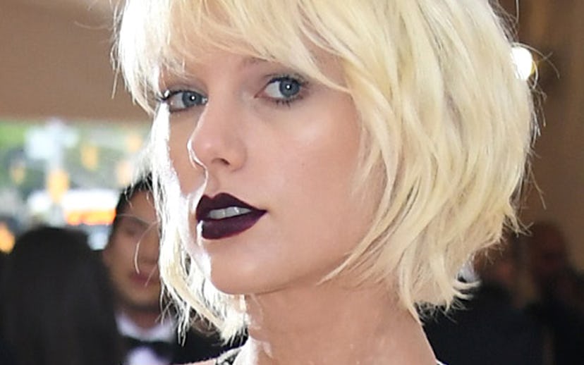 Just like Poppy Delevingne, Swift opted to pair her platinum locks with a super dark, vampy lip and nails. The two were also decked out in silver. Have we spotted this year's red carpet trend?