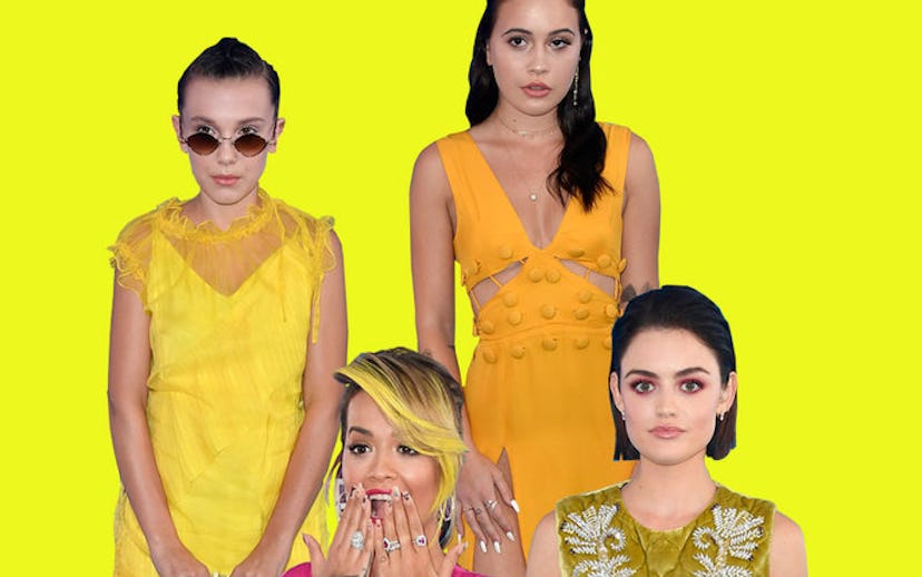 From gowns and pantsuits to more laid-back looks (all hail Zendaya’s casual pajama-menswear getup), we saw quite a mix of looks at last night’s ceremony. However, one trend stood out in particular: yellow. A color reserved for the brave or, well, Solange, many celebs, from Stranger Things' Millie Bobby Brown to Pretty Little Liars' Lucy Hale, rocked a variation of the vibrant shade. Some even took it as far as their hair color.