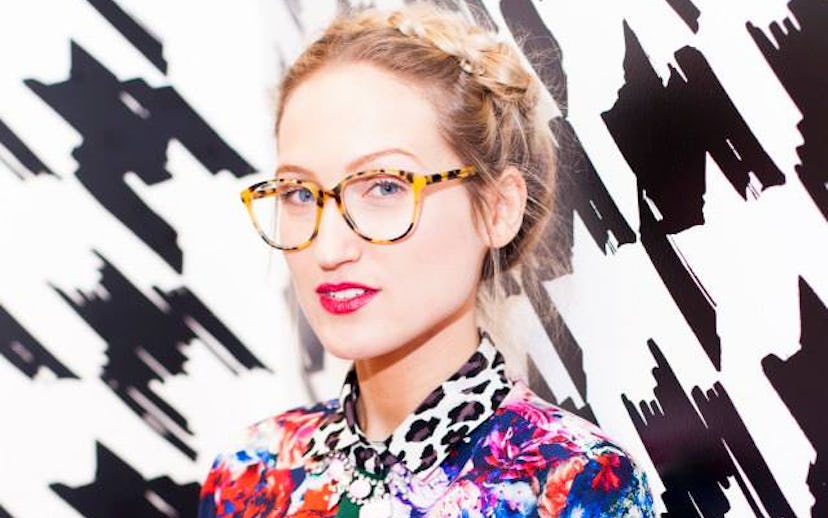 Even though shoe designer and self-proclaimed flamingo enthusiast Sophia Webster doesn't have an apparel collection, doesn't mean she can't be inspiration for the ultimate spring outfit. Seriously, I'm not a musician and I'm pretty good at guitar hero. I am literally obsessed with this tortoise-shell-glasses-and-mismatched-printed-blouse combo that the creative cool girl is rocking at her fall '14 collection presentation. I need this entire thing, including the Heidi braids.