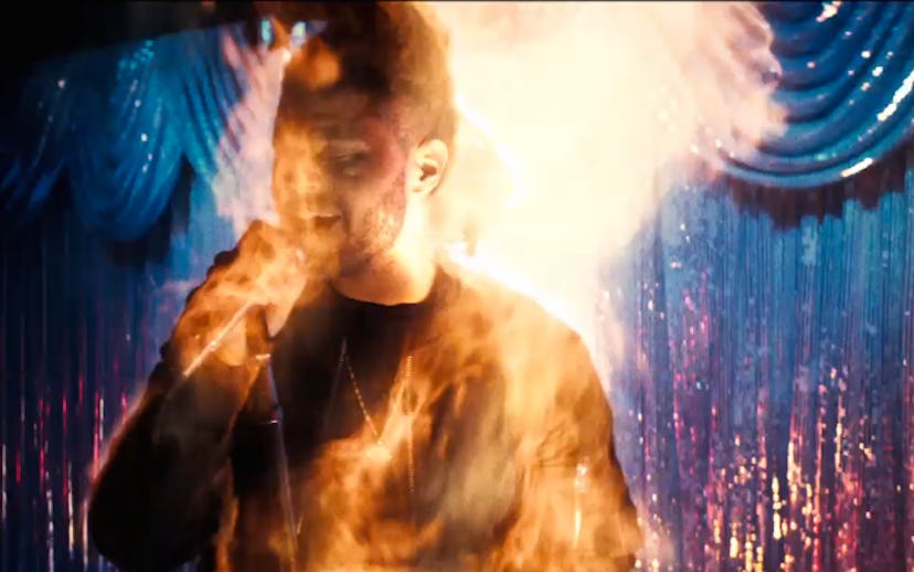 The Weeknd is so not about Tom Cruise getting all the clicks off his track, so he went ahead and dropped his own lip-synced performance of his summertime smash, "I Can't Feel My Face," via Apple Music. Directed by Grant Singer, who made his name directing Sky Ferreira videos and directed The Weeknd's "The Hills" clip, the video starts off as a highly stylized performance clip, with Abel Tesfaye performing his banger to a mildly disinterested crowd. Not even his awkward-cool dance moves can get them excited. It takes no less than one of the audience members lighting Tesfaye on fire to get them into it. Don't they know they're watching the world's next biggest pop star?