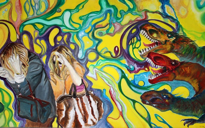 Randy Glance, Psychedelic Fashion Twins Hiding From Dinosaurs Metal Lunchbox, $35, available at THNK1994.