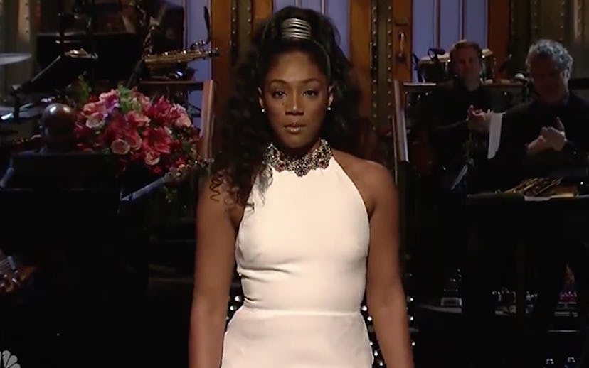 Tiffany Haddish made history last night when she became the first black female comedian to host Saturday Night Live—and now I wish she would host every weekend. She opened the show with a monologue that addressed the recent wave of sexual assault allegations in the news, including most recently against Louis CK. "Listen, fellas," Haddish said, offering what she called a "Tiff Tip," "if you got your thang thang out, and she got all her clothes on, you're wrong. You're in the wrong."
