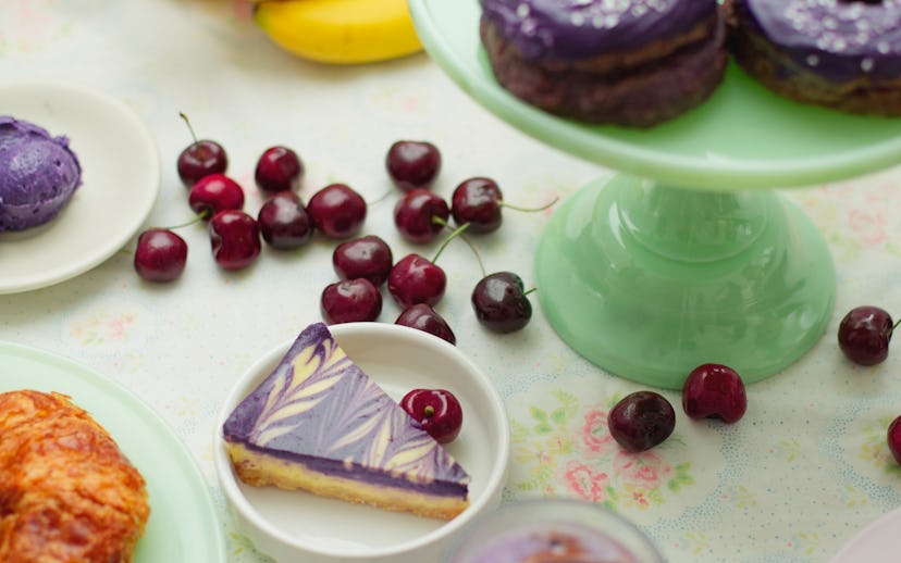 Clockwise from top right: Ube Bae donuts from Manila Social Club, Richard Gomez ube cocktail from Jeepney, ube compound butter from Manila Social Club, ube marble cheesecake from Maharlika, ube ice cream from Manila Social Club. Special thanks to comingsoonnewyork.com for the green glassware.