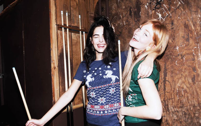 What happens when you combine quality ugly holiday gear, a rad dive bar, and models on pool tables? The most killer NYLONshop party EVER. Thats right—we decked our girls Rachel Sykes, Ivana Aleksich, Louise Luna, Maggie Houlihan, and Annabelle Eustache out in the best holiday wear to hit the shop this season and took over Turkey's Nest Tavern in Williamsburg for the photoshoot of our dreams. And yes, there was pizza involved.