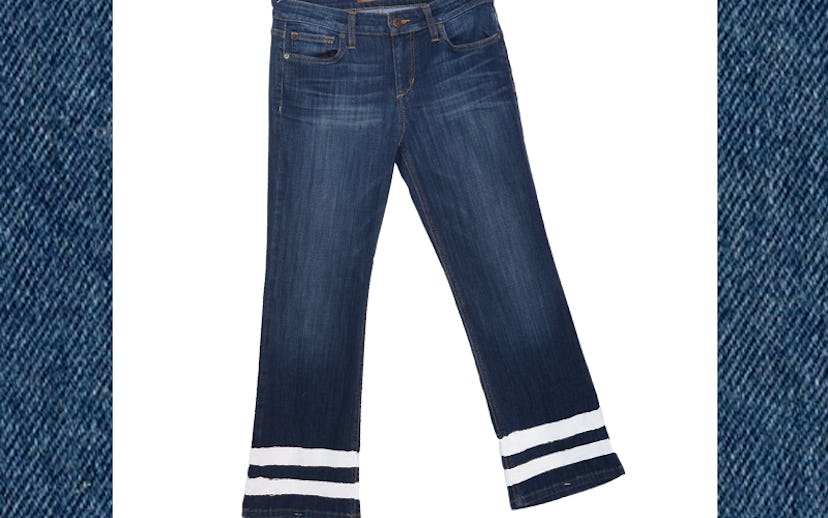 Step 3: Start with the bottom row and paint one side of the pants. Be sure to go over the stripe multiple times so the stripe feels solid and none of the denim seeps through.