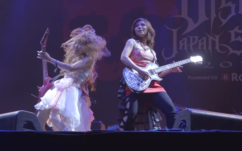 Heavy metal generally conjures up images of testosterone-fueled mosh pits, teased-out manes, and sweat-softened gauntlets, but as seen at Japan's first visual Kei music festival, billowing blue dresses do in fact have a home in metal too. Aldious, the only all-girl band at this year's inaugural Visual Japan Summit, dominated the stage with powerhouse musical talent and voracious head banging. The band was founded by Osaka native Yoshi, who serves as bandleader, composer, and guitarist, while Toki, guitarist; Sawa, bassist; Re:NO, vocalist; and drummer, Marina, joined in the following years. Their debut album, Deep Exceed, charted at 15 on Japan's Oricon album chart, catapulting them into the mainstream and germinating what has been called the "Girls Metal Band Boom," a blossoming of successful all-girl metal groups including Cyntia and the seemingly ubiquitous Babymetal.