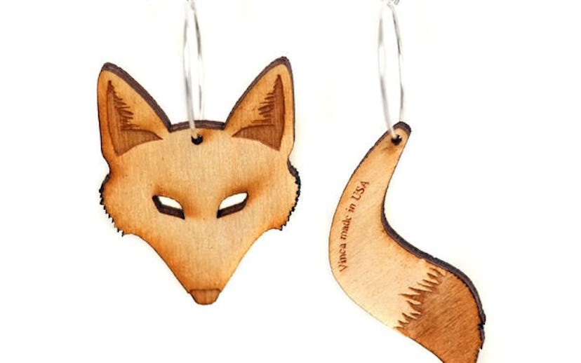 So I decided that now was definitely the time to take the risk, because if not now, then when!? In my walk on the wild side hunting for the ultimate pair of mismatched earrings, I came across trolls with different colored hair (electric pink for the left, electric green for the right) and a stormy night sky scene (dangly stars on the left and one long lightning bolt for the right). Yet none of them felt interesting enough--at least not as interesting as gold socks and a lavender tee--until I came across these Vinca USA fox earrings. What does the fox say? Get these ear Ring-ding-ding-ding-dingeringedings!--sorry, I had to go there.