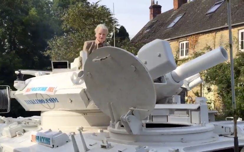 Dame Vivienne Westwood's anti-fracking tank rides to David Cameron's house in #Witney. #HeartNews pic.twitter.com/oRRn50ibBg — Thames Valley News (@HeartThamesNews) September 11, 2015