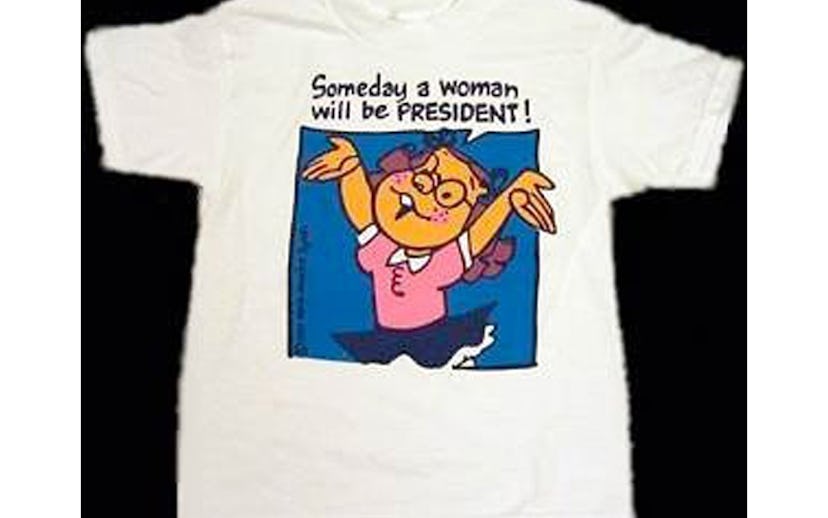 The shirt in question features the character Margaret from Hank Ketcham's cartoon series Dennis the Menace in an exuberant state, arms gleefully uplifted, proclaiming, "Someday a woman will be PRESIDENT." While this shirt might seem relatively innocuous, it was apparently so "offensive" and such an affront to the "family values" of some Florida Wal-Mart shoppers that it was pulled from the shelves. As the Telegraph reports, the T-shirt had been designed by Ann Molivar Ruben, who said, in response back in 1995, “that promoting females as leaders is still a very threatening concept in this country.'"