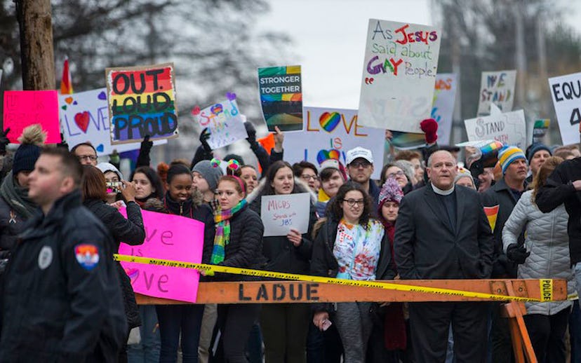 Pride St. Louis, a nonprofit focused on improving the well-being of the Missouri LGBTQIA community, rallied behind a counterprotest organized by students at the prep school. The hashtag #StandWithJake soon went viral, catching the ire of Westboro while demonstrating the town's inclusive values. At the protest, over 100 Ladue citizens came out in support of Bain, outnumbering the Westboro crowd by spades.