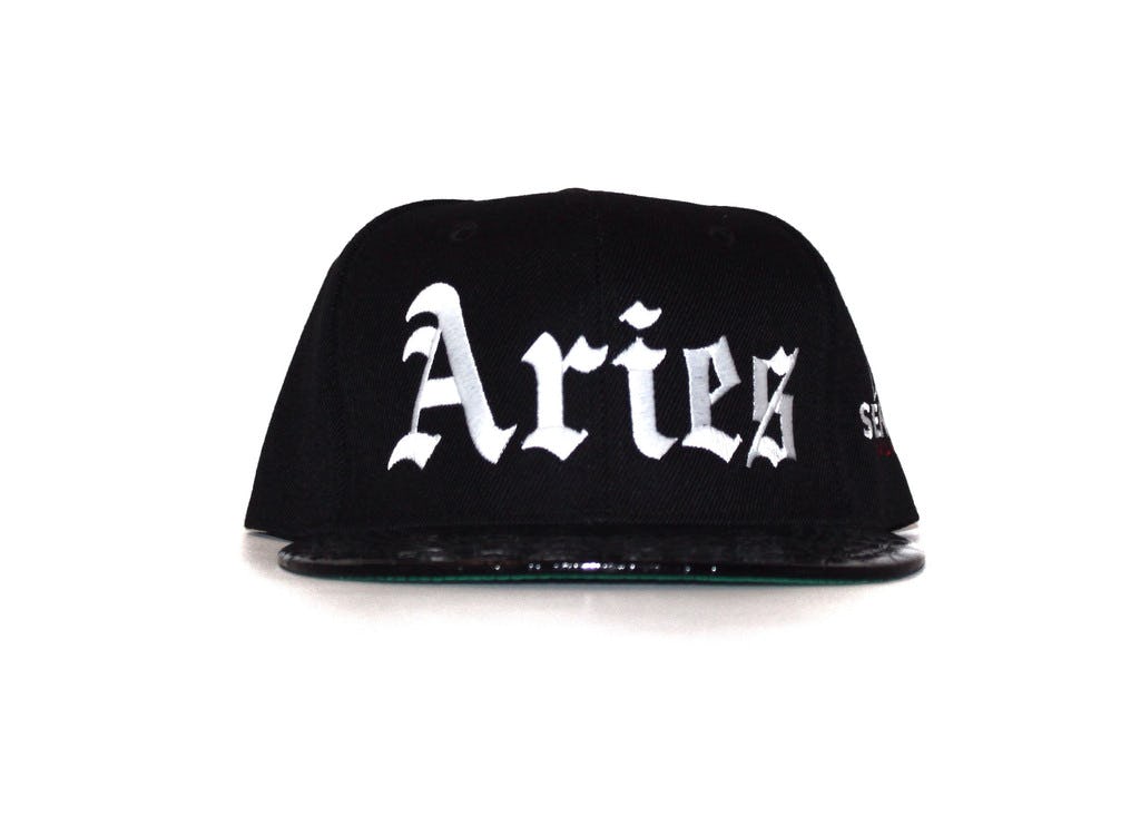 AriesSemper, aries snapback, $38, available at Shop Semper; Urban Outfitters, stamped zodiac necklace, $18, available at Urban Outfitters; Alex and Ani, aries charm bangle, $28, available at Alex and Ani.