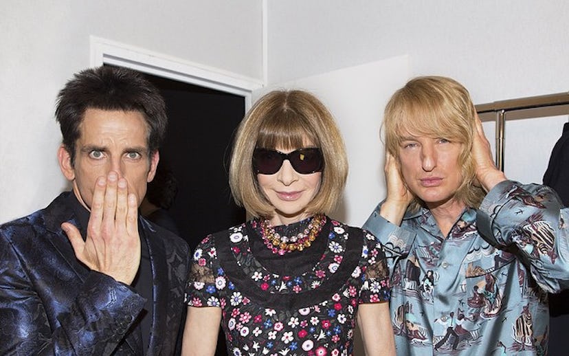 After models walked the Fall/Winter 2015 Valentino runway wearing both gothic and jewel-toned garments, the atmosphere changed. A dramatic instrumental soundtrack was replaced with The Human League's 1981 hit, "Don't You Want Me." Donned in blue brocade suits with jackets draped precariously over their shoulders, Stiller and Owen strode down either side of the runway, meeting in the middle and exchanging a series of in-character glances as Derek Zoolander and his rival Hansel. While the modeling world has certainly changed since the 2001 film first hit theaters, there's something about a good blue steel that's simply timeless.