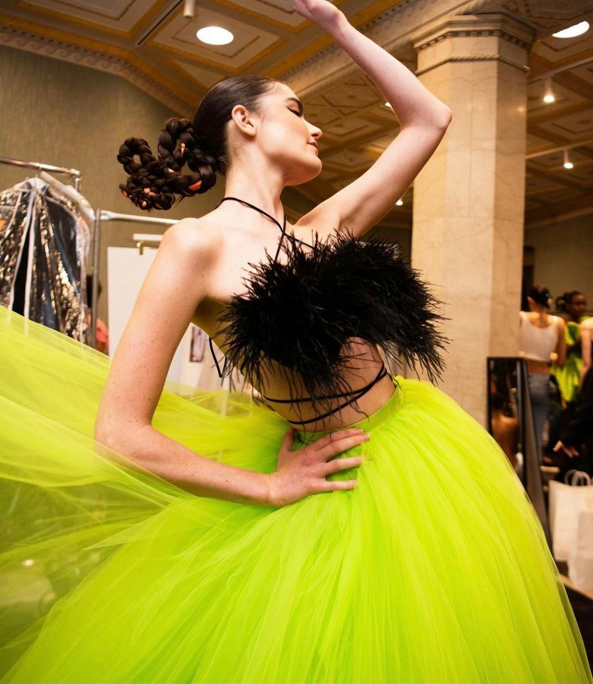 Everything about Christian Siriano’s show this year was sculptural, including these woven plats. Jawara for Dyson created the look by looping a ribbon and wire along with long hair extensions to create the whimsical shapes.