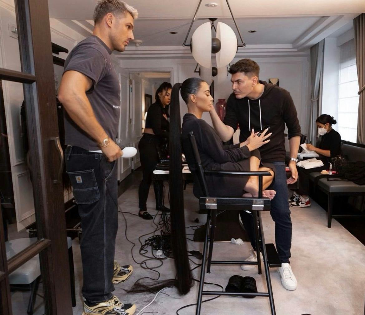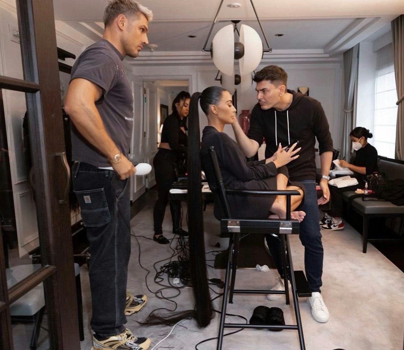 Although her Met Gala look covered her entire face in opaque black fabric, Kim still got a full face beat by Mario Dedivanovic and wore an over-six-fit-long ponytail devised by Chris Appleton.
