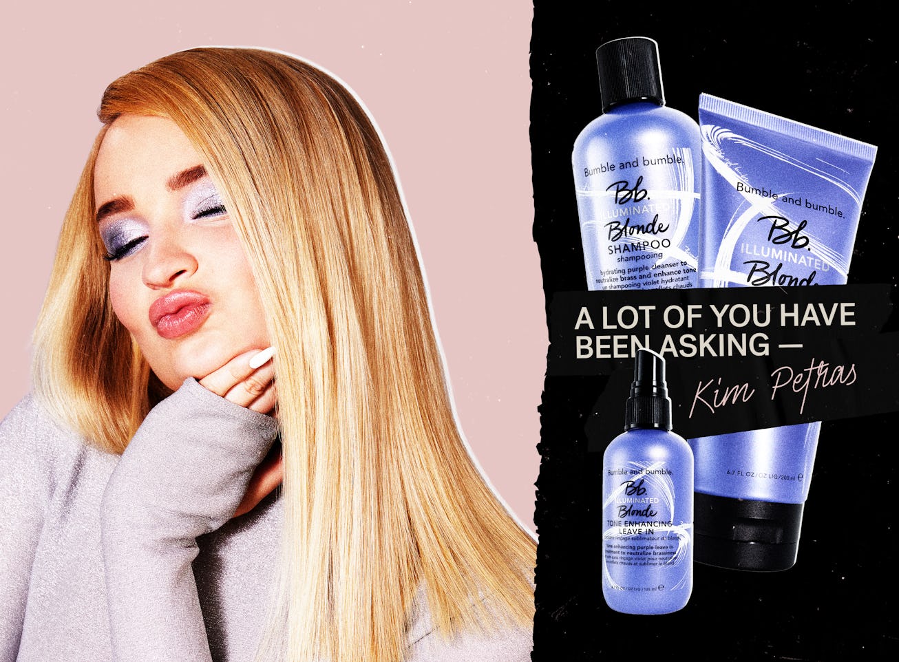 Kim knows the power that platinum hair holds– she lists Marilyn Monroe, Debbie Harry, and Billy Idol among her favorite beauty icons. Now, she has also teamed up with Bumble and bumble to represent their Bb. Illuminated Blonde collection, which is formulated just for light and bright blondes to strengthen hair and help tone away unwanted orange-y pigments.