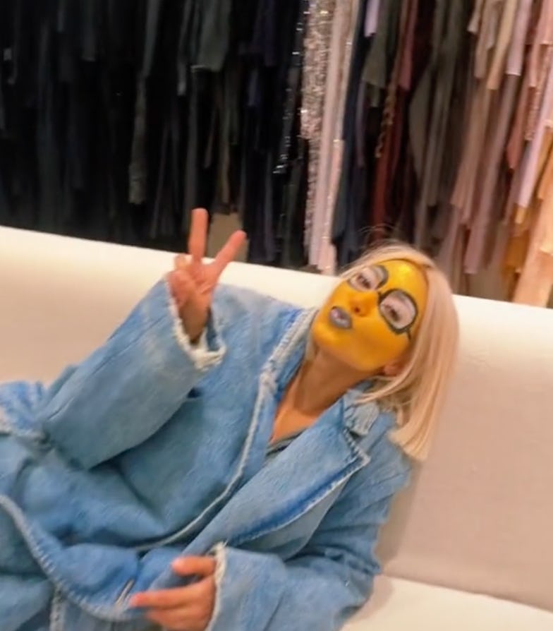 The video was posted on North and Kim’s joint TikTok account yesterday, with the caption “💛MOMMY MINION 💛”. In the TikTok video, North uses multiple eyeshadow palettes to transform her mother into a minion—goggles and all. She starts with a pale white foundation, painting it all over Kim’s face until she has a base for the yellow pigments to show up on. Then she uses colors from four different eyeshadow palettes to create shades of yellow, contouring her mum’s cheekbones and nose with an orange color. North then uses a gold shadow for an overall glittery effect, as only she would.