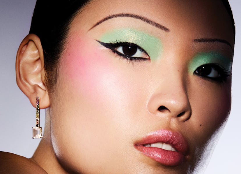 Starting with a clean base, Flowers sculpts the cheekbones using a touch of MAKE Beauty Skin Mimetic Microsuede Blush in Fuchsia Flush. Moving to the lips, she gives them an unexpected metallic gleam by patting on pink shades from Pat McGrath's Mothership X: Moonlit Seduction and Mothership VII: Divine Rose palettes. For the pastel green eye, she reaches for P.Louise Coloured Base in Green Envy, amplified by a fierce, elongated winged eyeliner. To complete the look, she adds delicate cluster lashes and draws on ‘90s-inspired skinny brows for a glam, doll-like effect.
