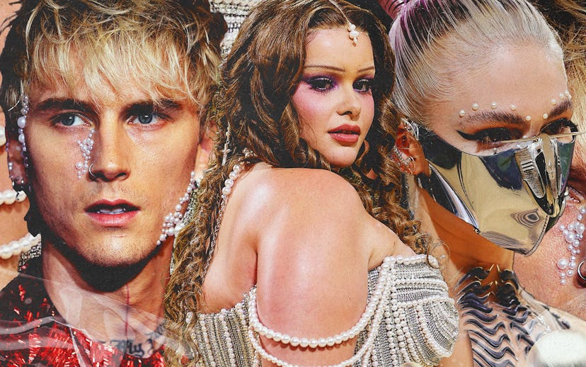 At the 2021 MTV VMAs, Machine Gun Kelly broke the internet with girlfriend Megan Fox and their coordinated out-of-the sea ensembles. As an add-on to his very red and very sequined outfit he has a partially bedazzled face. Pearls in a range of sizes stuck onto his face, contouring the sides of his jawline, nose, and sideburns was essentially the rapper's first-ever makeup look.