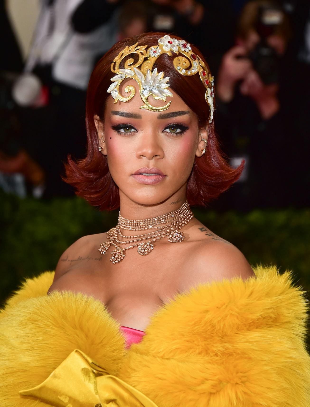 In 2015, The Met went on to honor China's influence in fashion. Naturally, Rihanna nailed the theme — showing graciously how you can honor a culture without appropriating it. Wearing a show-stopping yellow couture gown by Chinese designer Guo Pei, she paired the royal look with beauty just as thoughtful, donning an auburn red, chin-length bob with flipped-up ends, and an intricate gold jeweled headpiece atop the front of her head and bangs. As to not overdo it, she kept her makeup subtle with a rosy flush on her cheeks, and some sharp, blunt brows.