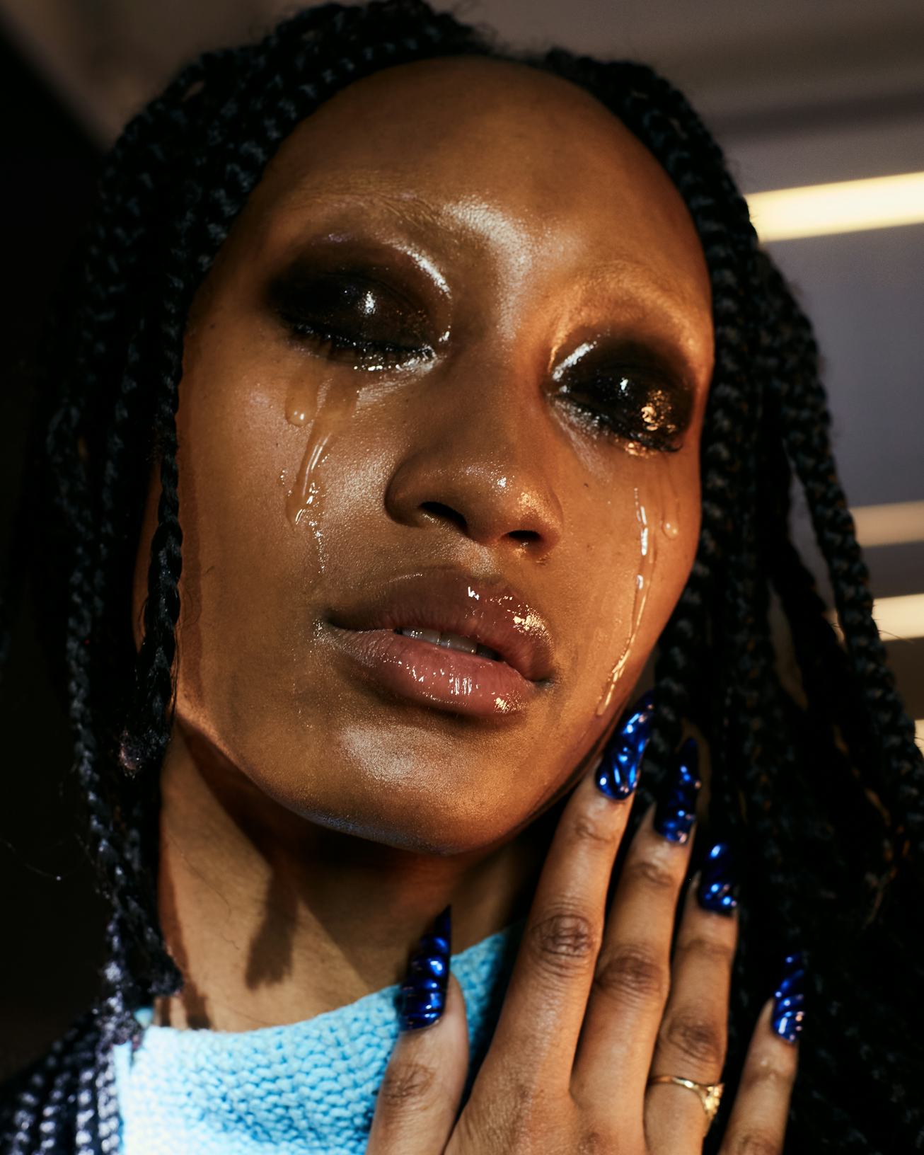 Over the past couple of years, crying makeup tutorials have taken off on social media. We can, in part, thank celebrity crying selfies—including Bella Hadid’s carousel of crying Instagram pictures in 2021 and her openess about mental health, Lizzo’s crying video singing Billie Eilish’s “Happier Than Ever” (posted in the same week as Bella), and Nicola Peltz Beckham’s low-res crying photos last year—for the surge in “sad girl beauty”. The trend has created, in a sense, a performative and filtered version of vulnerability. This performance was given a new and deeper meaning at the latest Head of State runway show during New York Fashion Week.